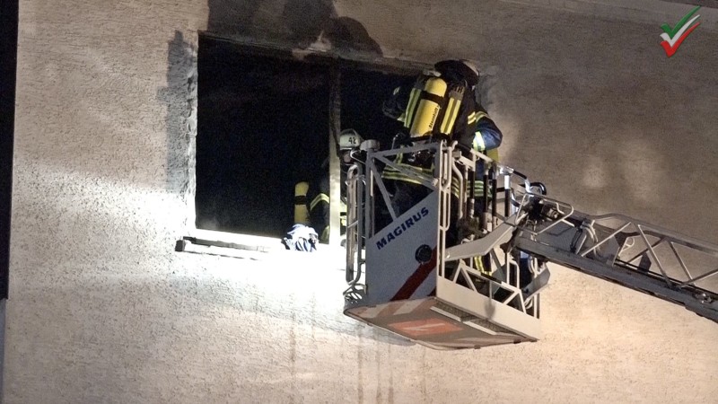 Sofort wurde durch einen Innenangriff die mögliche Menschenrettung eingeleitet. Tatsächlich befand sich eine bewusstlose Person in der Brandwohnung. Der 77-jährige Mann wurde aus der brennenden und vollständig verqualmten Wohnung gerettet. Zeitgleich wurden mit der Drehleiter die Rolläden entfernt und das Fenster von außen geöffnet.